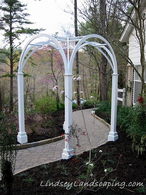 Both the stonework and arbor was custom built for the homeowner to encourage visitors to utilize her front entrance.